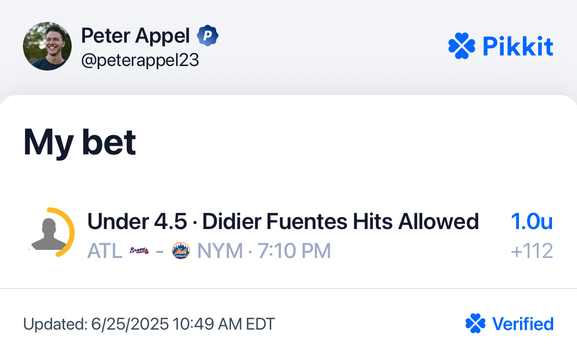 This bet is very similar to yesterday’s wager on Jacob Latz Under 4.5 Hits. The only difference is that Didier Fuentes has better stuff, and my projection on Fuentes is lower than what I had with Latz.