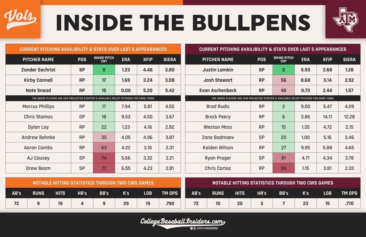Texas A&M will be without their best reliever in Cortez, who they burned in Sunday’s game, but they still have plenty of great arms. This chart from CollegeBaseballInsiders.com tracks the likely arms we’ll see today. SIERA is the most important stat, as ERA can be wonky in college baseball; it’s not a proper showing of talent. As you can see, we have plenty of rested arms on both sides with low SIERA’s and xFIP’s.