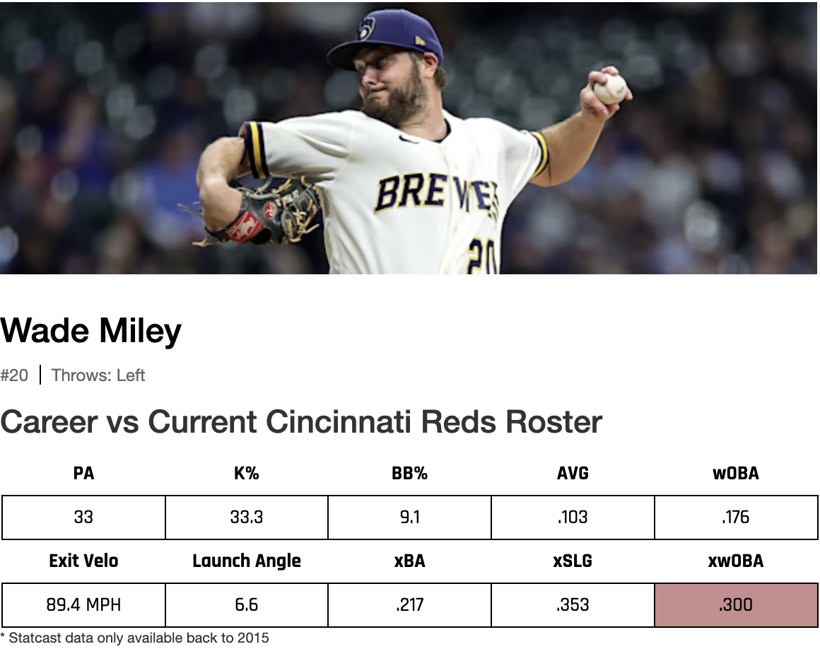 Miley has also dominated the Reds over 13 career starts (14 appearances) with a 2.86 ERA. He faced them last year, tossing six shutout innings while allowing four hits and striking out eight. If we had fully healthy Miley, this would be a full unit play.