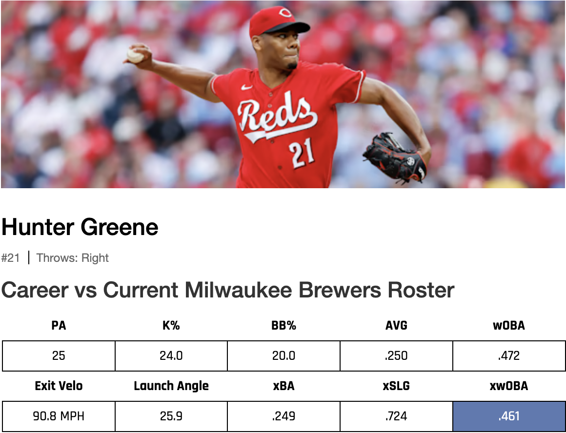 The Brewers offense has been raking against right-handed pitching, ranking third in the league with a 125 wRC+ against righties. They’ve scored 17 runs in the first two games, and had no issue with Frankie Montas or Graham Ashcraft. I don’t think they struggle against Greene either.
