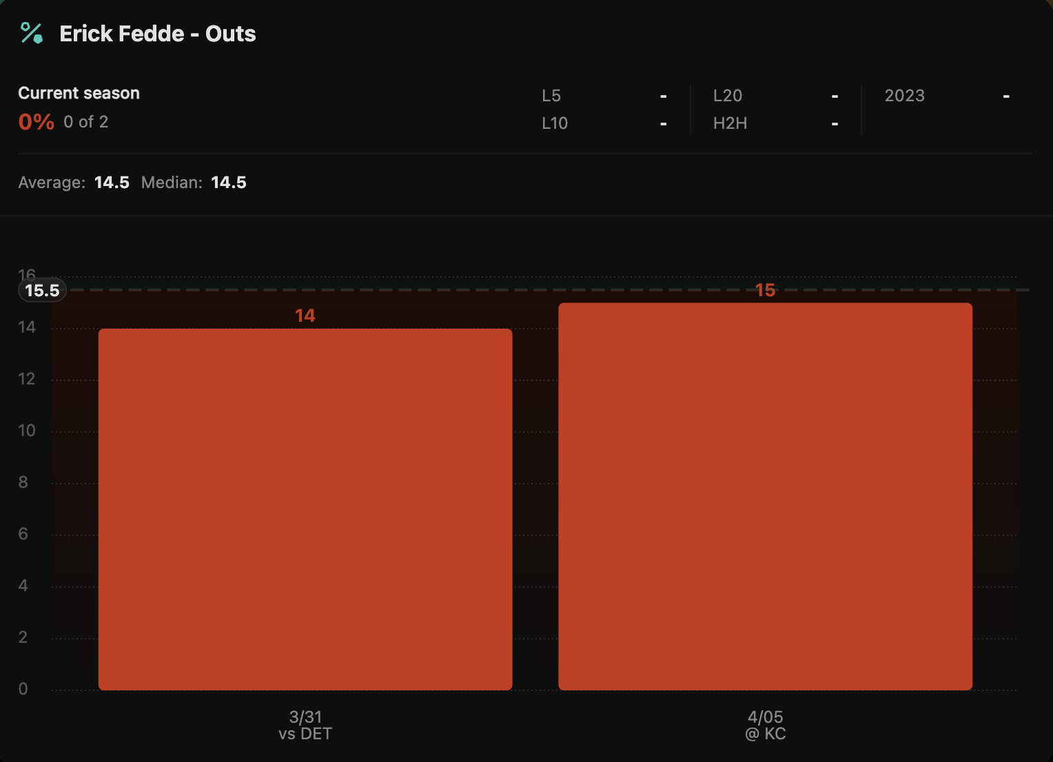 I have him projected at a 16.5 pitching-outs line. I think the market is a bit lower due to him not going over this line yet. It’s early, and Fedde has already wet his feet with two starts. If he pitches well, he should go over this. Even if he doesn’t pitch well, I still think the White Sox leave him in there.