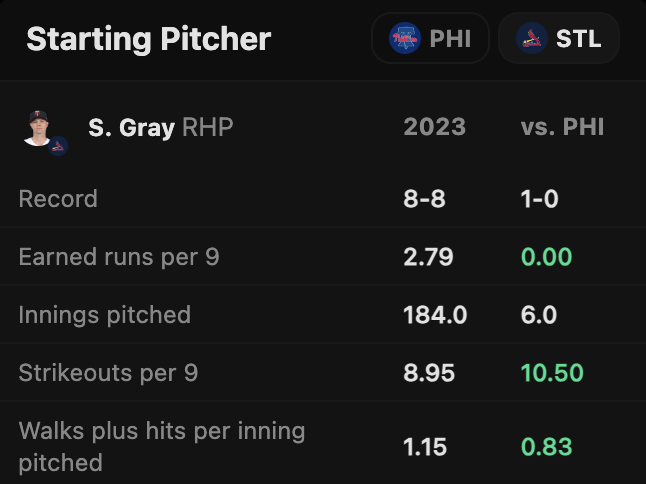 With a full workload, this would not be a play. Gray has an above-average strikeout rate against the Phillies overall. Philly is doing a better job not striking out, as we noted with MacKenzie Gore. They strike out near the league average rate against righties, ranking 13th highest.