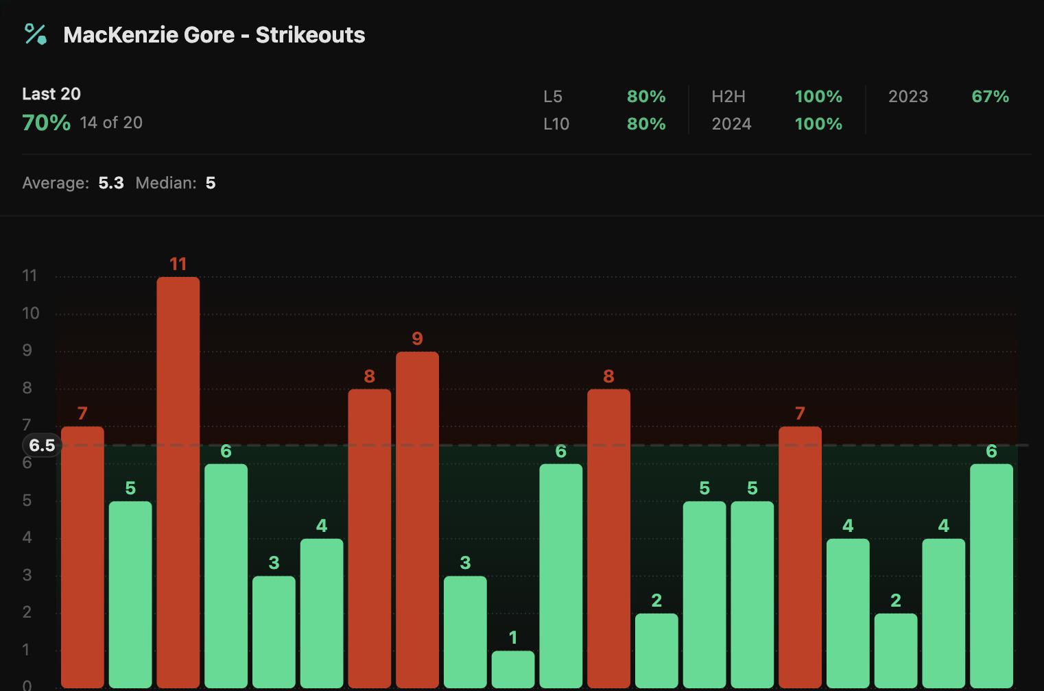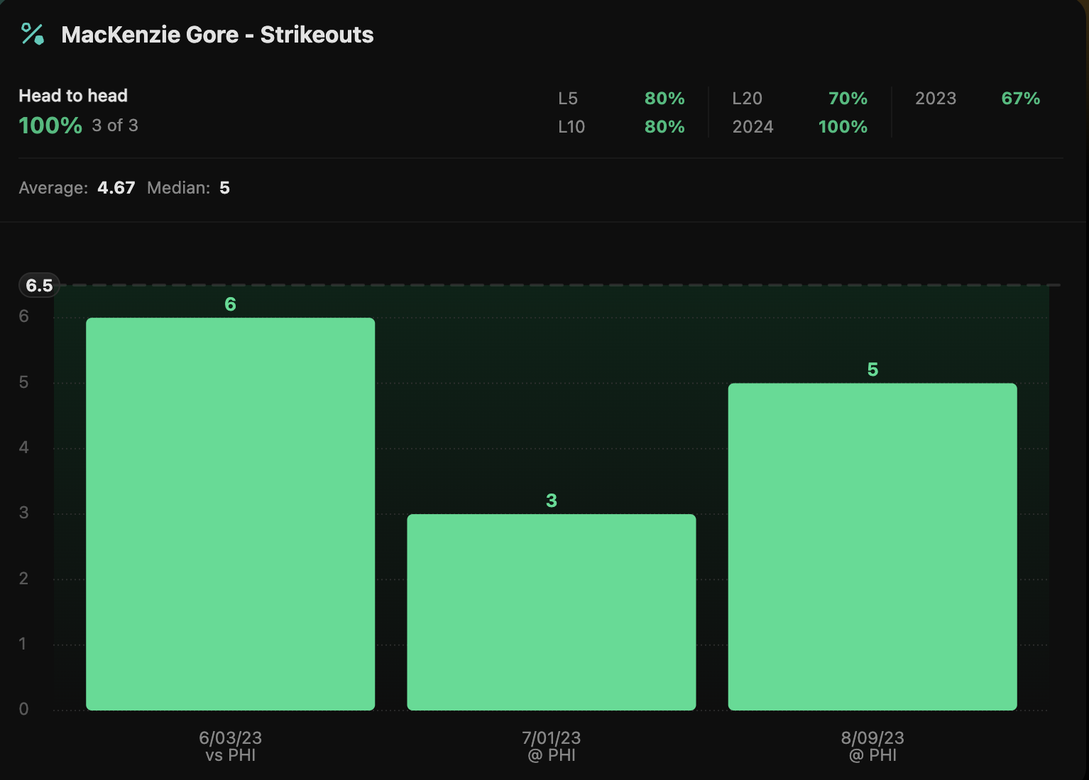 For this game, we only focus on the National’s starting pitcher, MacKenzie Gore. He’s a very talented player, one of the big pieces in the Juan Soto trade. I think the market is a little high on him, and with the wind driving the total down, I think his props are inflated.