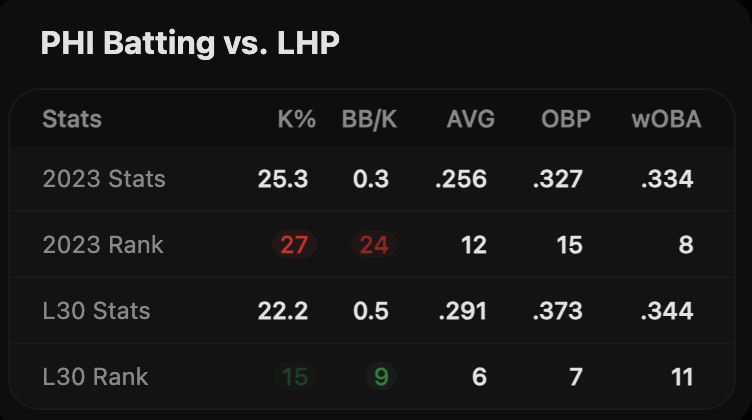 I bet the under before the lineup came out, but I’m happy with how the Phillies will attack him. Pache has a 7% lower strikeout rate against lefties than Johan Rojas in center field. Merrifield has a 14.3% K rate against lefties compared to Brandon Marsh’s 39.1% in left field. Sosa does strike out more than Stott, but overall, this is the best contact lineup the Phillies can put out against lefties.