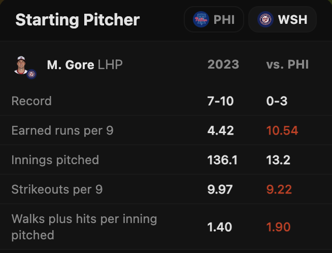 Gore has faced the Phillies thrice, but it hasn’t gone well. Over 13 innings, he’s allowed sixteen runs to give him a 10.54 ERA. He should be aided by the weather today to keep the ball in the park, but that doesn’t mean the strikeouts will be there.