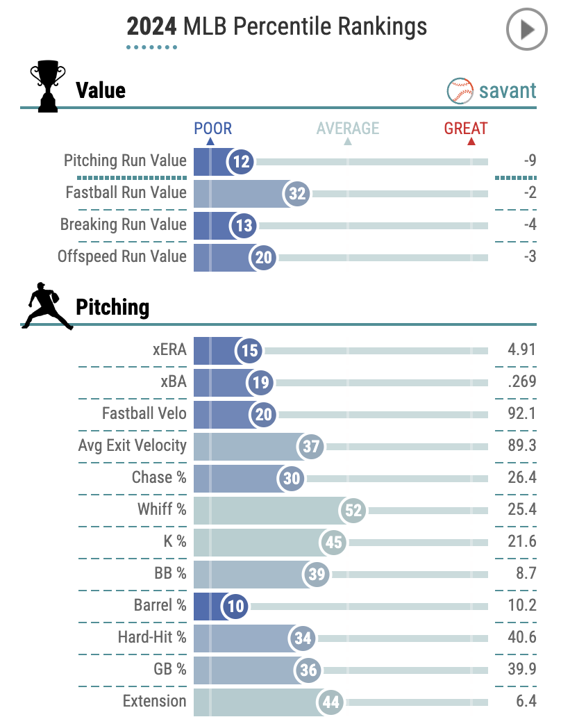 Lance Lynn is on fade watch for the second half. As you can see from the image from Baseball Savant, respectfully, he has no redeeming qualities this season, and all of his ERA estimators imply regression is coming. He’s also 37 years old; how much longer can he rely on 90-93 MPH fastballs?