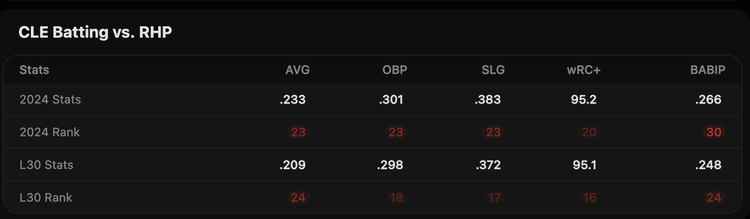 The Guardians scored eight runs yesterday, but their offense didn’t look like it was heating up. They still have a below-average wRC+ against righties this year, and their xBA yesterday was just .258. Only three balls were hit over 100 MPH, and two were home runs from Jose Ramirez. He hit three home runs in this game; let’s see him do it again. That was the third time the Guardians scored more than four runs, and one of those times, it took extra innings to do it.