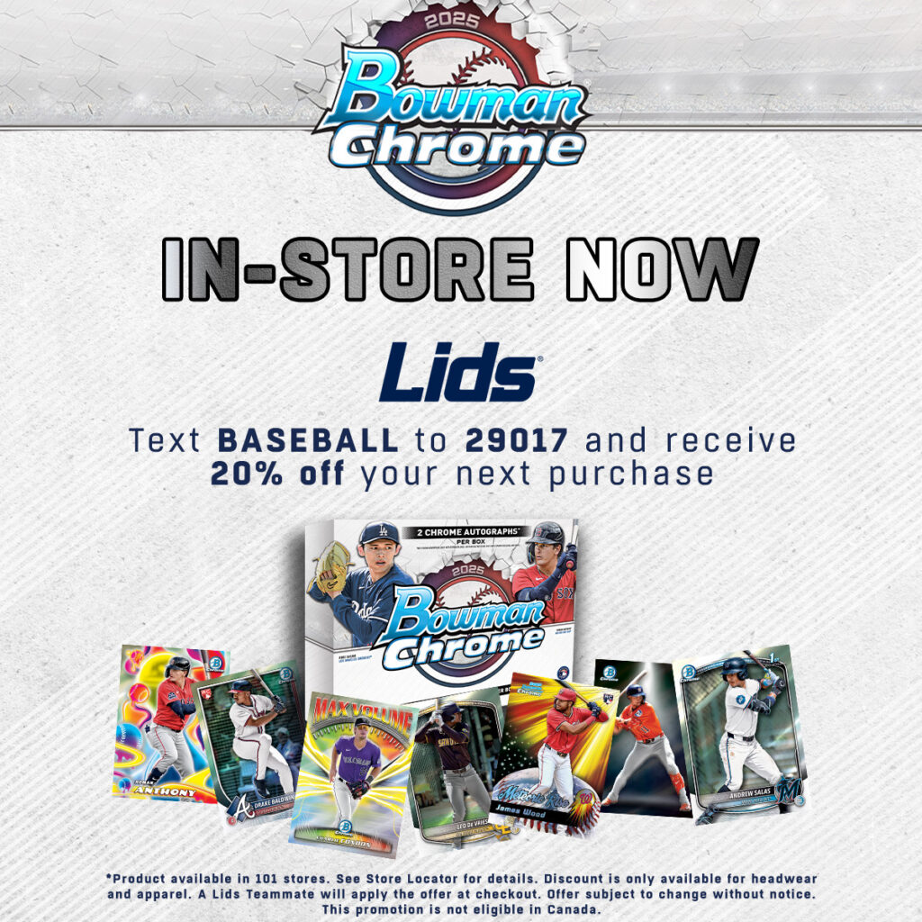 In addition to carrying Bowman Chrome hobby boxes, Lids is offering our readers and exclusive offer. All you have to do is text 29017 to get 20% off your next purchase of headwear and apparel (some exclusions do apply). This discount will get you 20% off key upcoming headwear releases like the fall color pack and any postseason gear you need for an October playoff run!