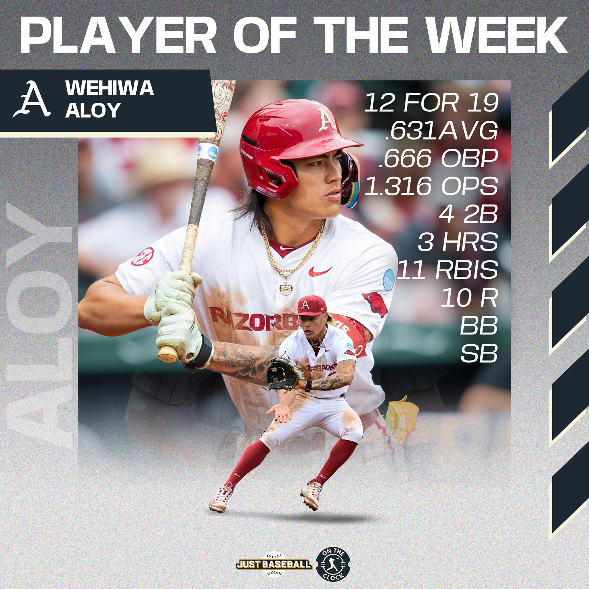 | SS Wehiwa Aloy, Arkansas | 12-for-19, 10 R, 4 2B, 3 HR, 11 RBI, BB, SB |