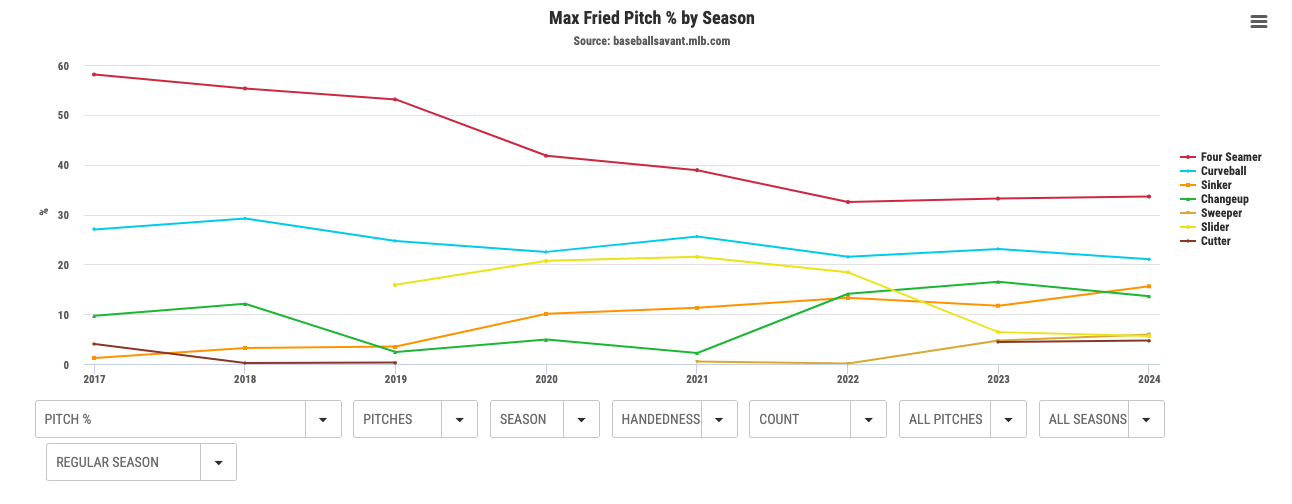 Like Snell, Fried’s fastball usage has come down over the course of his career, with a sinker being more prominently featured in 2024. He’s always thrown his curveball a bunch, but his slider usage dropped to new lows in 2023 and ’24. He’s not quite a six- or seven-pitch pitcher, but he’s shown the ability to change his arsenal over time and introduce new offerings when needed — another selling point for any interested teams.