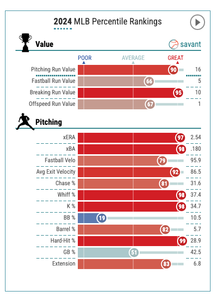 After his return on July 9, Snell led baseball in strikeout percentage (38.1%), ERA (1.23), K-BB% (28.1%), batting average against (.123) and FIP (1.77) over 80.1 innings.