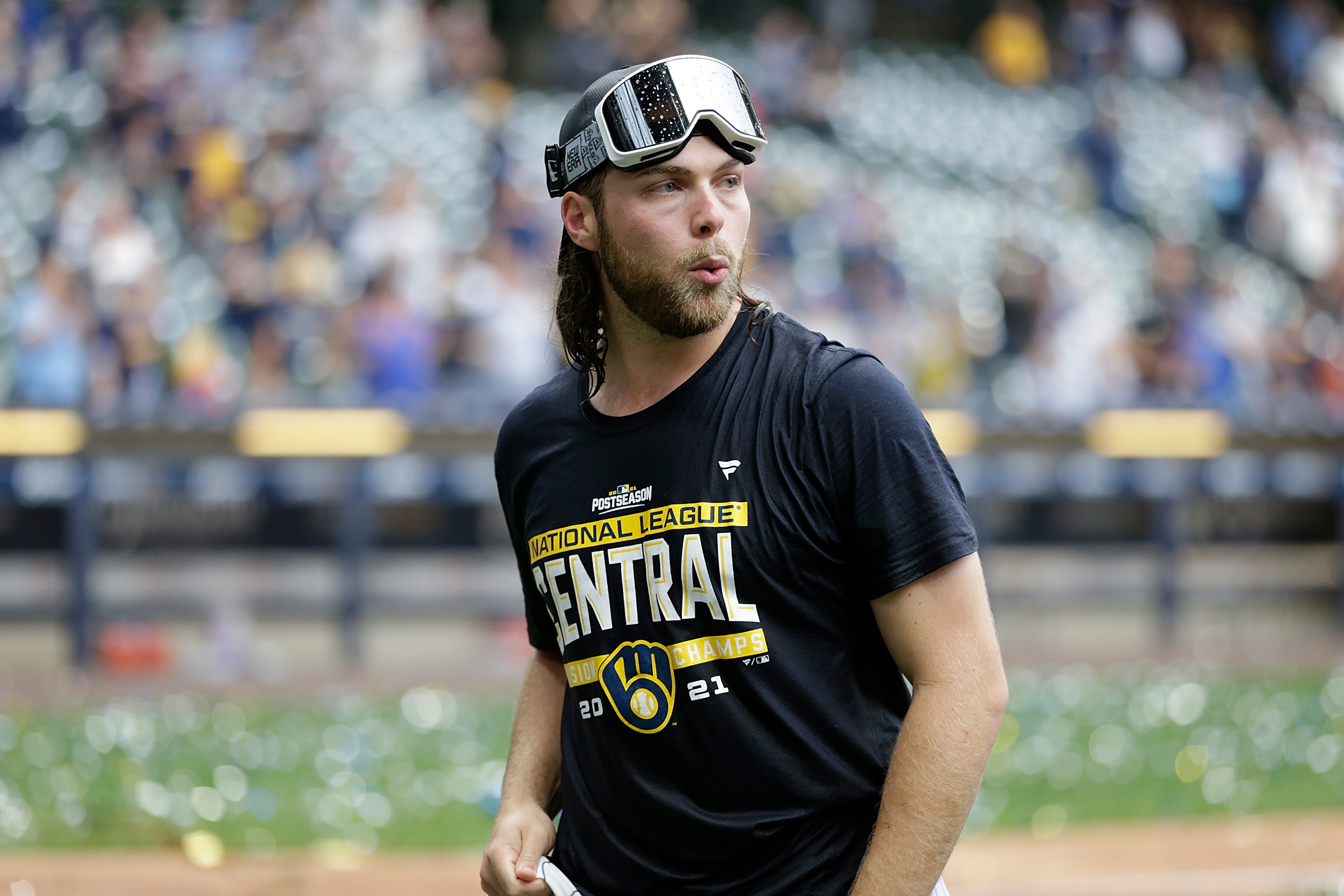 MILWAUKEE, WISCONSIN – SEPTEMBER 26: Corbin Burnes #39 of the Milwaukee Brewers celebrates winning the Central Division title after the game against the New York Mets at American Family Field on September 26, 2021 in Milwaukee, Wisconsin. Brewers defeated the Mets 8-4. (Photo by John Fisher/Getty Images)