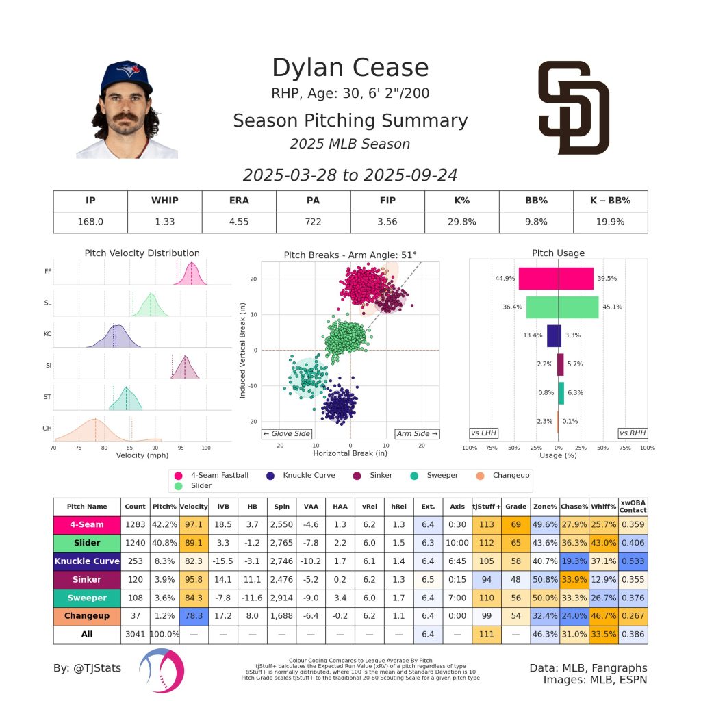To that end, they’ve made some deliberate changes to put his delivery and pitch mix, hoping an expanded repertoire paired with better defense behind him will help Cease consistently look like the 2022 and 2024 versions of himself.