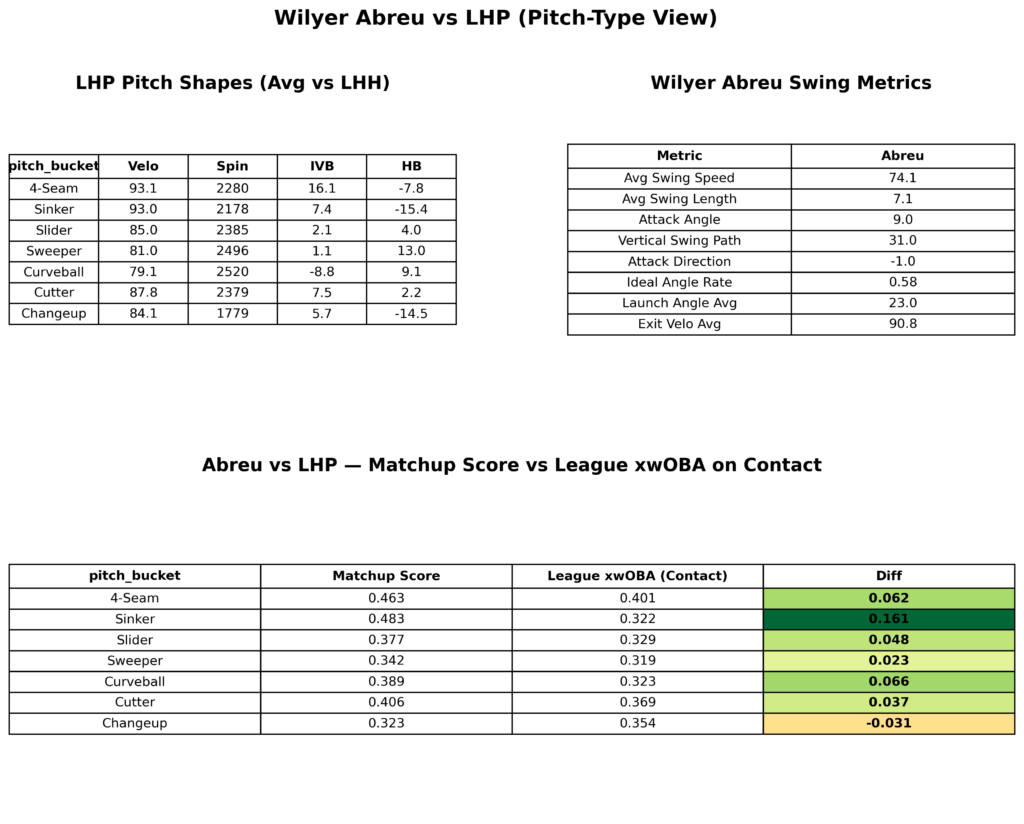 To evaluate how Wilyer Abreu’s performance could translate against left-handed pitching, I used a matchup model designed to simulate how a hitter’s swing characteristics interact with common pitch shapes.