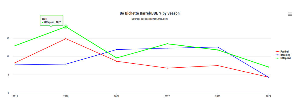 In the past, Bichette has always hit over .300 on fastballs, and in 2024, that number dropped to .232, despite his lowest career whiff rate on the pitch (12.3%). I should note his expected batting average against velocity was .284, higher, but still short of career norms.