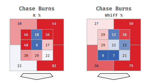 You can see how Burns has used the top of the zone with his fastball to get swing and miss, but it also sets up his slider. Raising the eye level of a batter with 100 mph fastball only to break off a slider that starts in the zone and dart away from righties causes fits. The bottom right corner of the image above shows how effective his slider can be to force batters to chase.