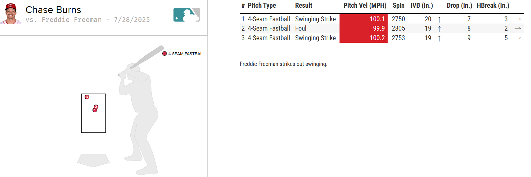 Burns went 100.1 mph right down the middle with his first pitch before returning to that location with 99.9 mph. He finished Freeman with an elevated fastball at 100.2 mph, three pitches, three fastball, three strikes.