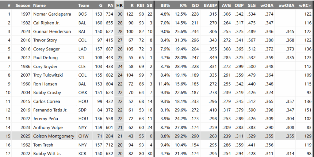 - 2025 Colson Montgomery: 21 HR, 129 wRC+ (71 G)