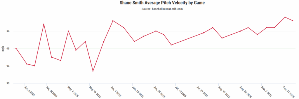 Smith averaged above 96.0 MPH on his fastball nine times in 2025, and six of them came in his final 10 starts.