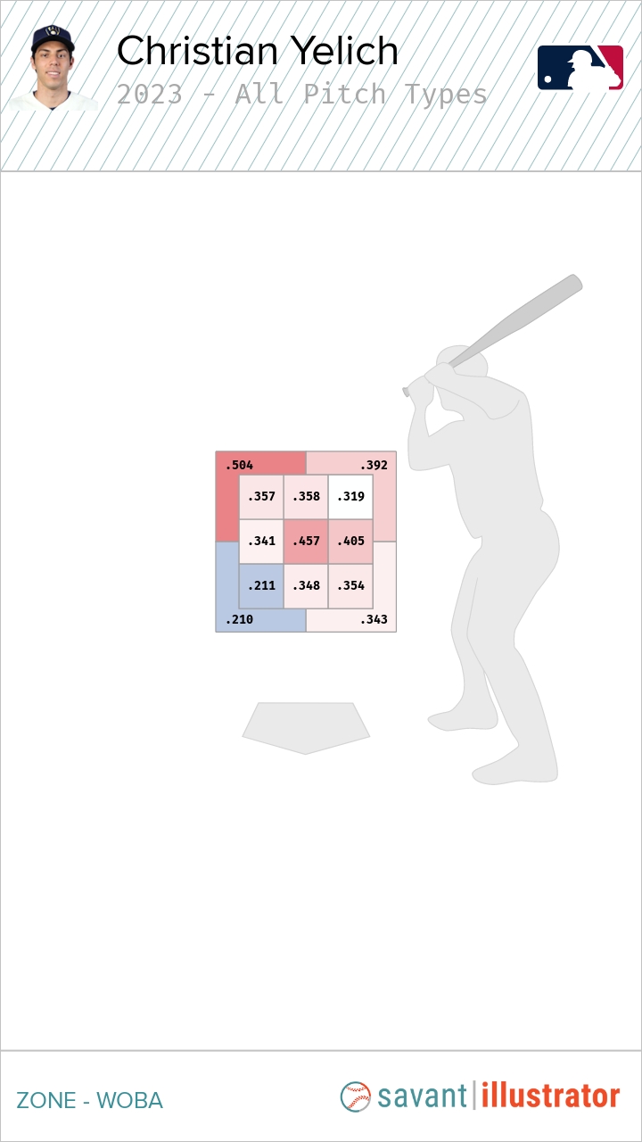 Secondly, Yelich continues to post high quality-of-contact numbers. For the past few seasons, he has ranked near the top of the league in exit velocity and hard-hit rate, and that trend has continued in 2023. His hard-hit rate sits at 51.2%, which is in the 93rd percentile and is the second-best mark of his career (only behind the shortened 2020 season).