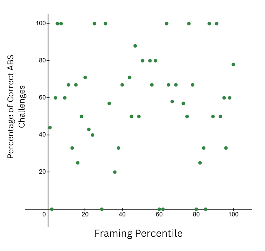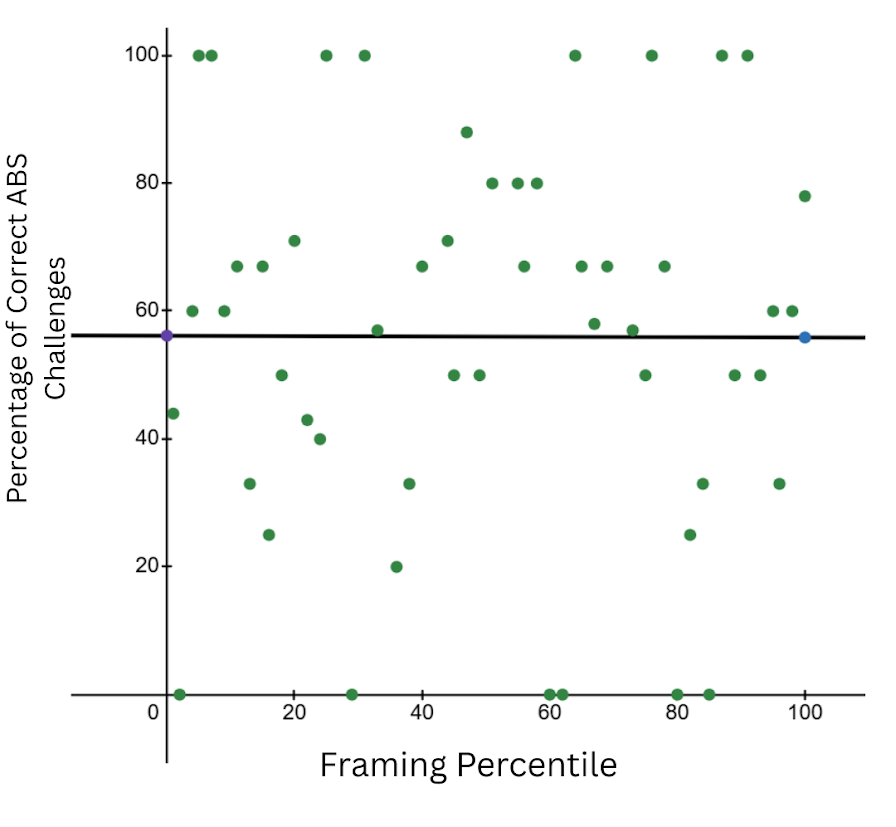 However, this is where the line of best fit comes in. Adding this line will allow us to see any slight trends that may not immediately stand out when looking at the graph, giving us a better idea of the true relation between framing ability and correct ABS challenges.