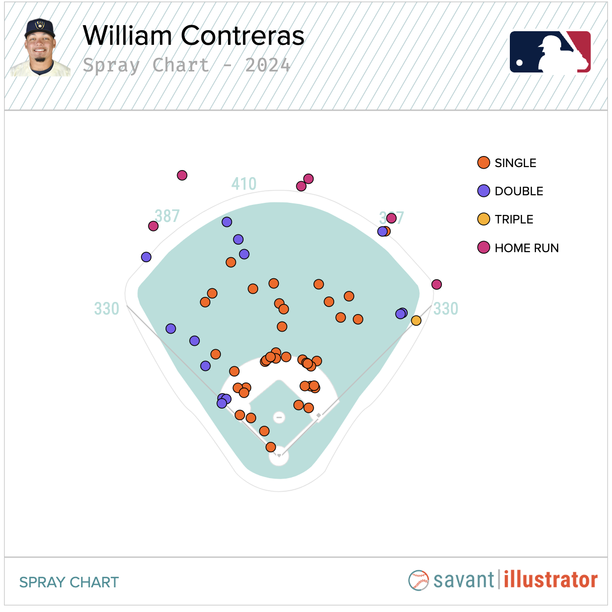 Contreras has pole-to-pole power, and he utilizes all fields in his approach. Below is his 2024 spray chart, which highlights just how successful Contreras has been at spraying the ball all over the field: