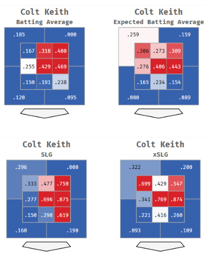 Keith performed well on pitches on the inside, especially middle and high. That area is where he did the majority of his damage while pitches low and on the outer part of the zone were troubling for him.