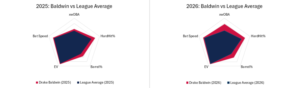 In 2025, Baldwin produced a 91.7 mph average exit velocity, ranking top 50 in MLB. This was only 0.3 mph lower than Vladimir Guerrero Jr. and 0.4 mph higher than Cal Raleigh. His 49.6% hard-hit rate tied Raleigh and ranked higher than Gunnar Henderson, Mike Trout, and Julio Rodriguez.