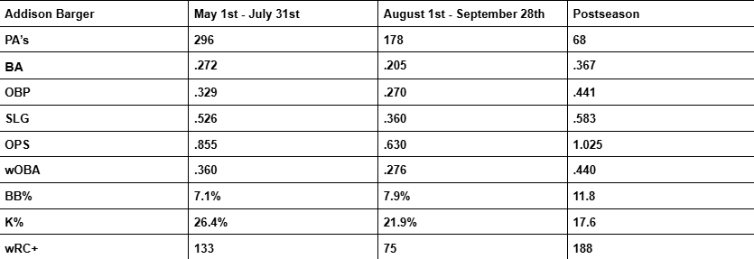 When you breakdown Barger’s season into three blocks, you may be surprised at just how good the production was for the vast majority of his season: