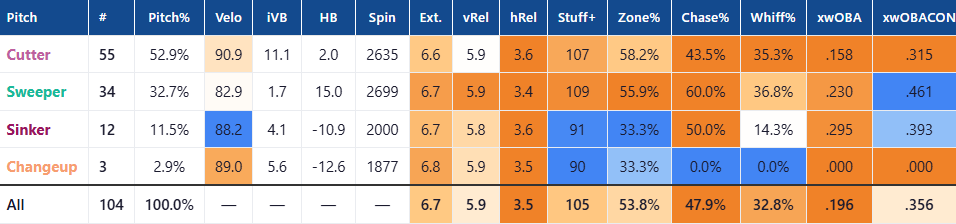 Fluharty’s pitch mix in 2025 consisted of two pitches, a cutter and a sweeper. Both offerings performed extremely well and induced an above average amount of whiff (27.9% and 37.3% respectively).