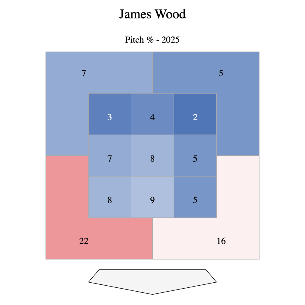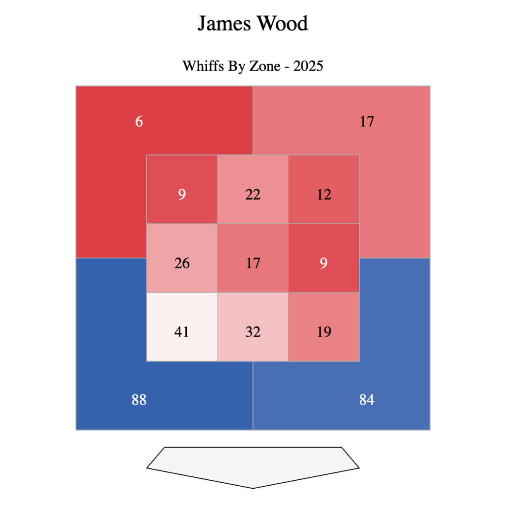 Wood’s 32.1% strikeout rate last year was the second-highest in MLB among qualified hitters and his 32.9% whiff rate was among the worst in the league. With Wood at the plate, pitchers have a cut-and-dry idea of how to approach him to get swings and misses – these strike zone charts haven’t changed much in 2026.