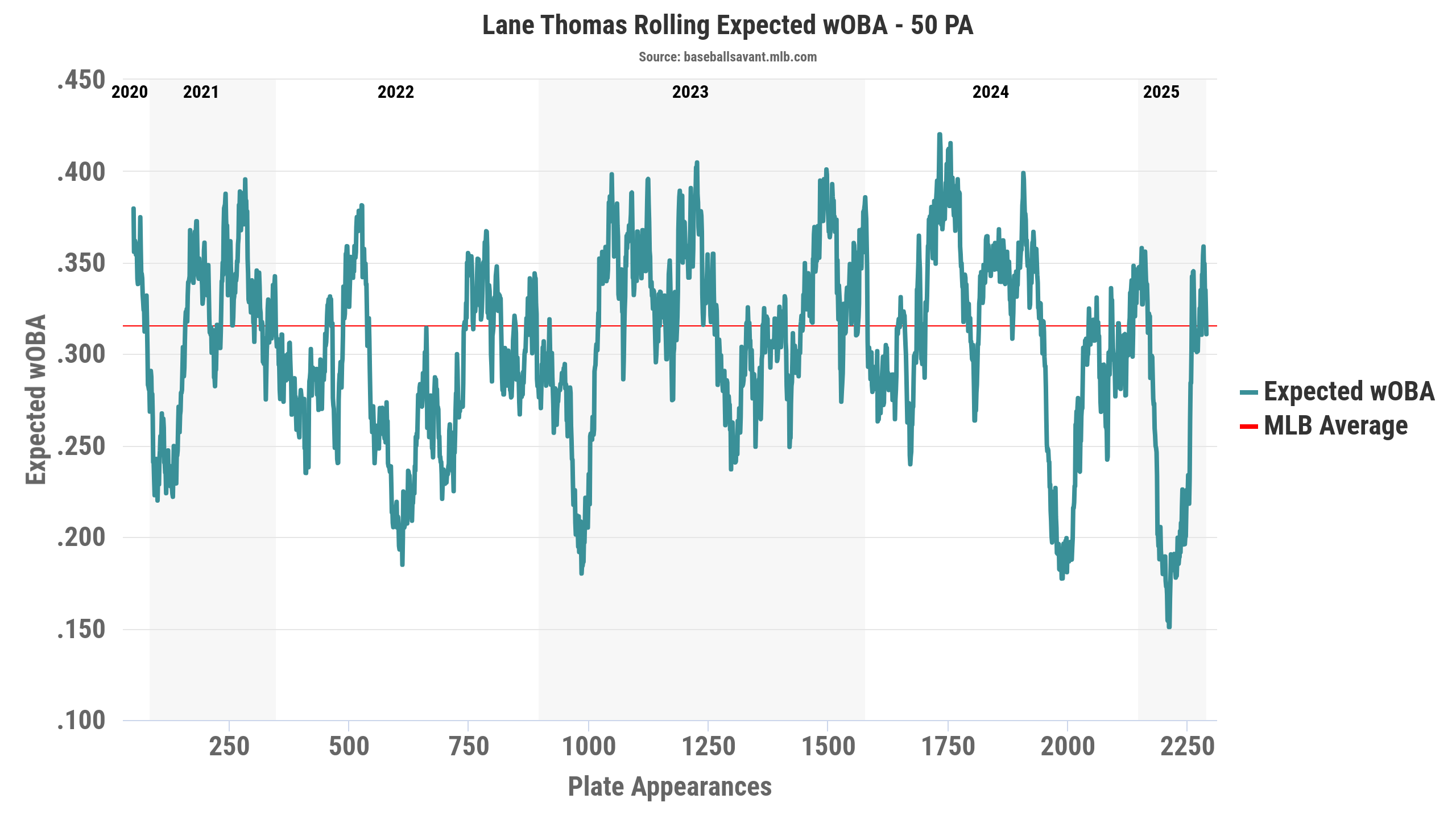 Based on his xwOBA trend over his career, Thomas has shown an ability to bounce back after down seasons, with 2021 and 2023 being prime examples. The Royals are banking on Thomas having one of his patented rebounds in Kansas City, with the hope that he is fully healthy to do so.