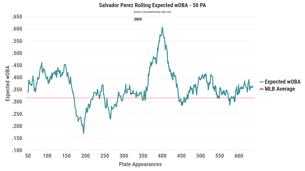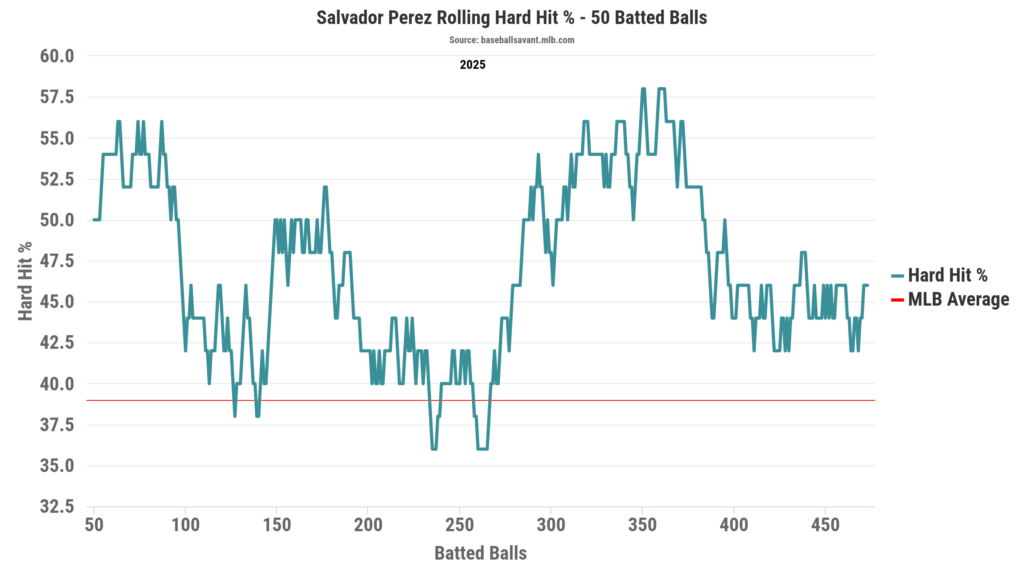 In terms of hard-hit rate, Salvy looked even better. Yes, he was slightly below average around the 120th batted-ball mark and had some valleys around the 240th and 260th mark as well. That said, he was a well-above-average hitter in terms of hard-hit in 2025, with peaks reaching near the 60% mark around the 350th batted-ball range.