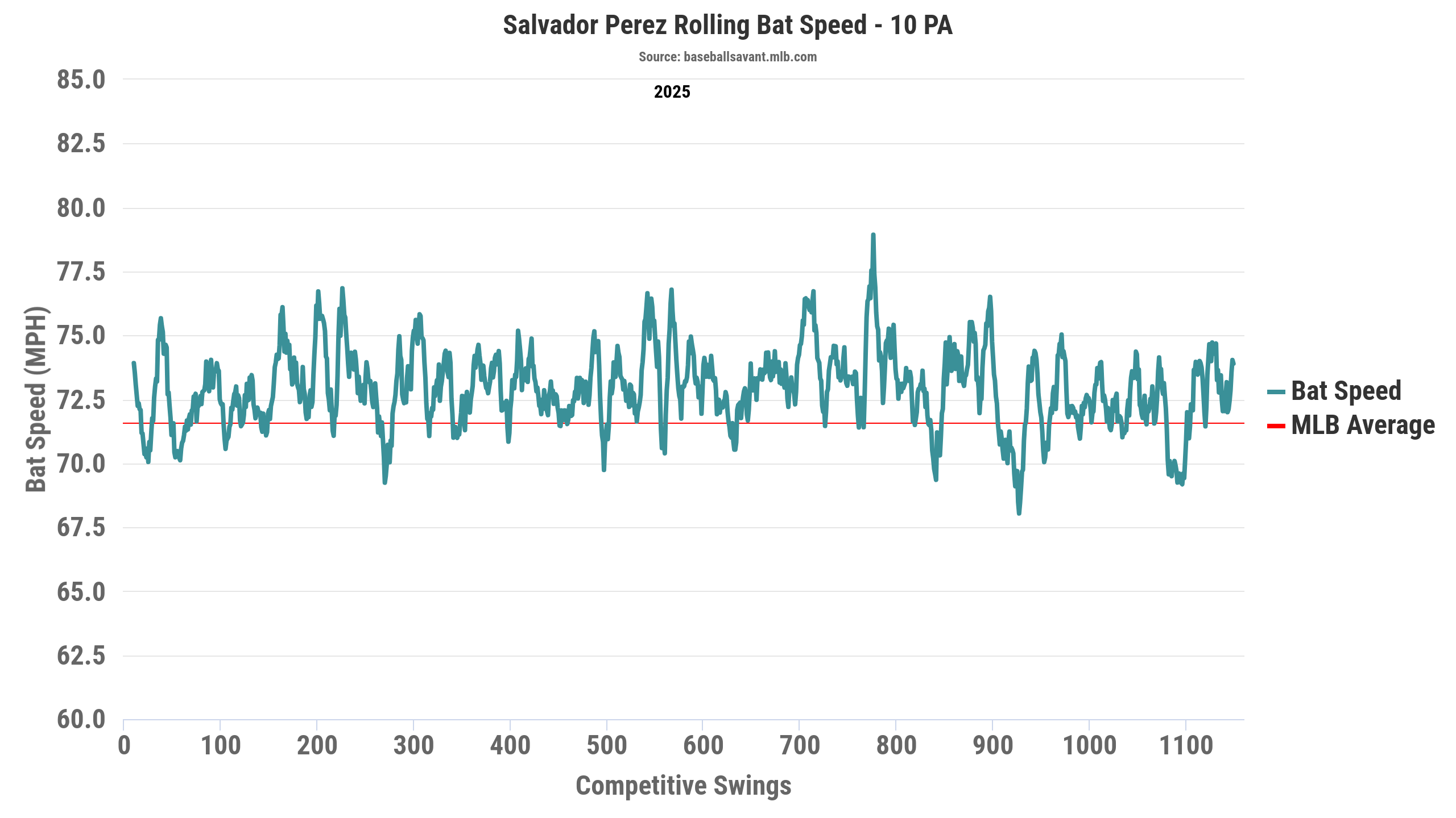 There are some dips here and there, especially around the 910th competitive-swing range. Still, he’s clearly an above-average hitter when it comes to generating batting speed, regularly surpassing 75 MPH and touching near 80 MPH on occasion. Strong bat speed often leads to positive outcomes, especially for power hitters.