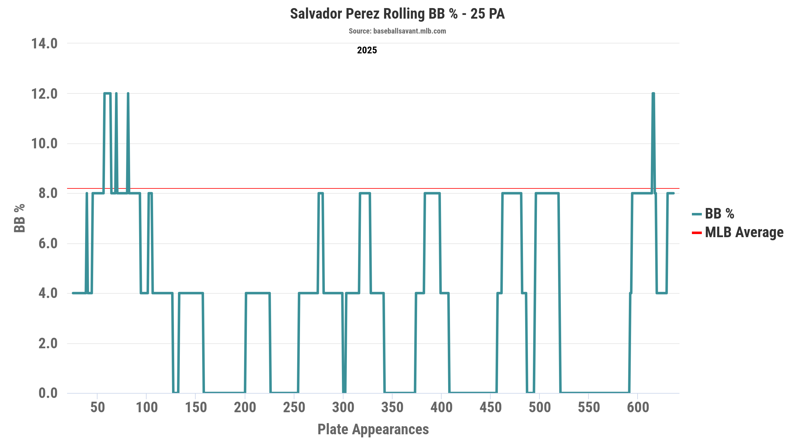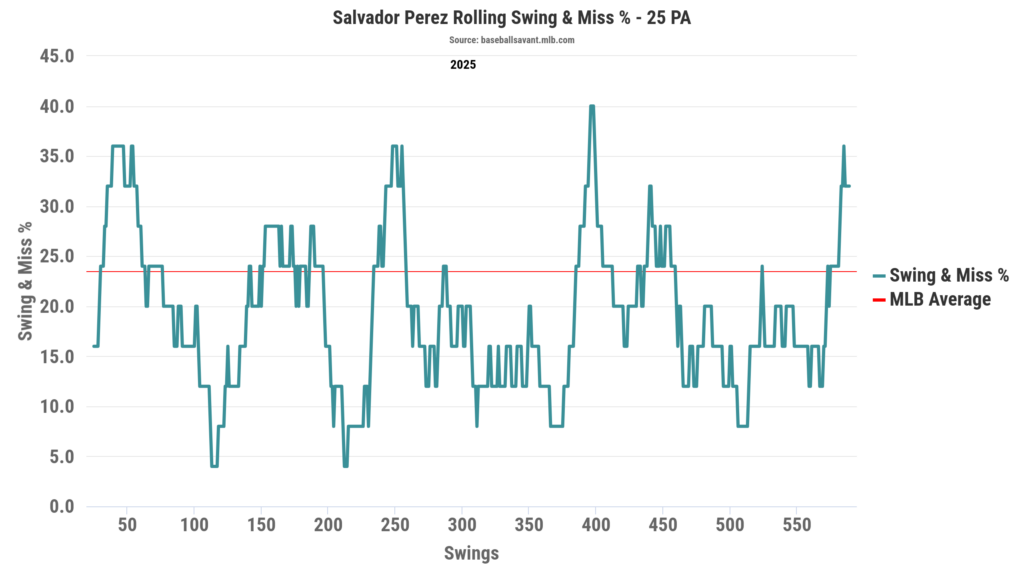 After posting a 0.34 BB/K ratio in 2024, his best mark since the 2013 season (when it was 0.44), Perez saw his BB/K ratio regress to 0.22 a year ago. His K% remained stable at 19.5% last year, just a 0.3% difference. However, his BB% fell from a career-best 6.7% to 4.4% last year, more in line with his career 3.9% BB%.