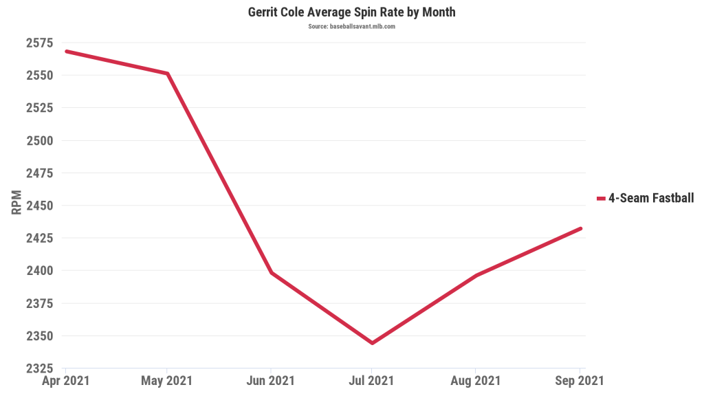 From the above chart, it’s quite clear that something changed for Cole after the foreign substance crackdown was put into place, with his fastball spin rate dropping more than 200 RPM from May into July. Cole’s effectiveness waned slightly from his norm, as he gave up 11 earned runs over his next three starts, while struggling with command.