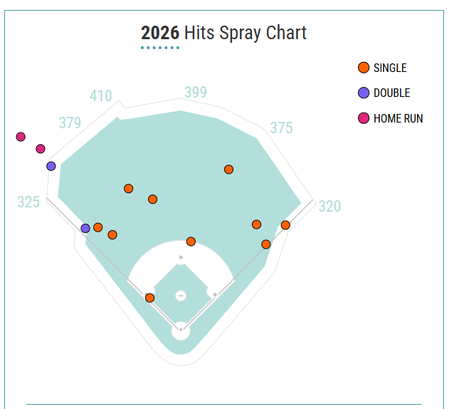 The pull-side power may begin to explain the numbers underperforming his underlying stats as well. If teams are aware of his limited power to the opposite field, then the outfielders can better shift to accommodate his spray chart. Doubles may turn into flyouts should these power trends continue.