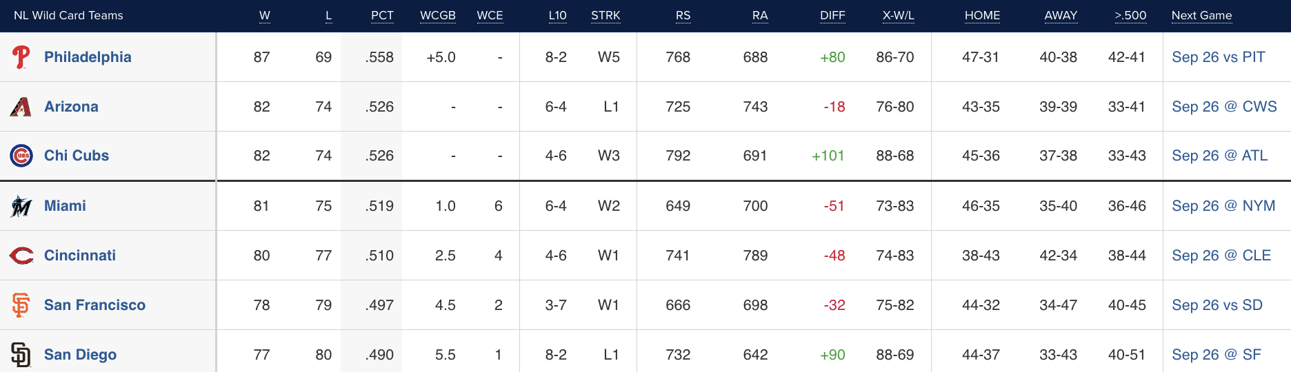 While the Phillies have their spot all but locked away, there is a six-team race for the final two spots to represent the NL Wild Card. Arizona, Chicago (NL), Miami, Cincinnati, San Francisco, and, believe it or not, Josh Hader, even the San Diego Padres are all still contending.
