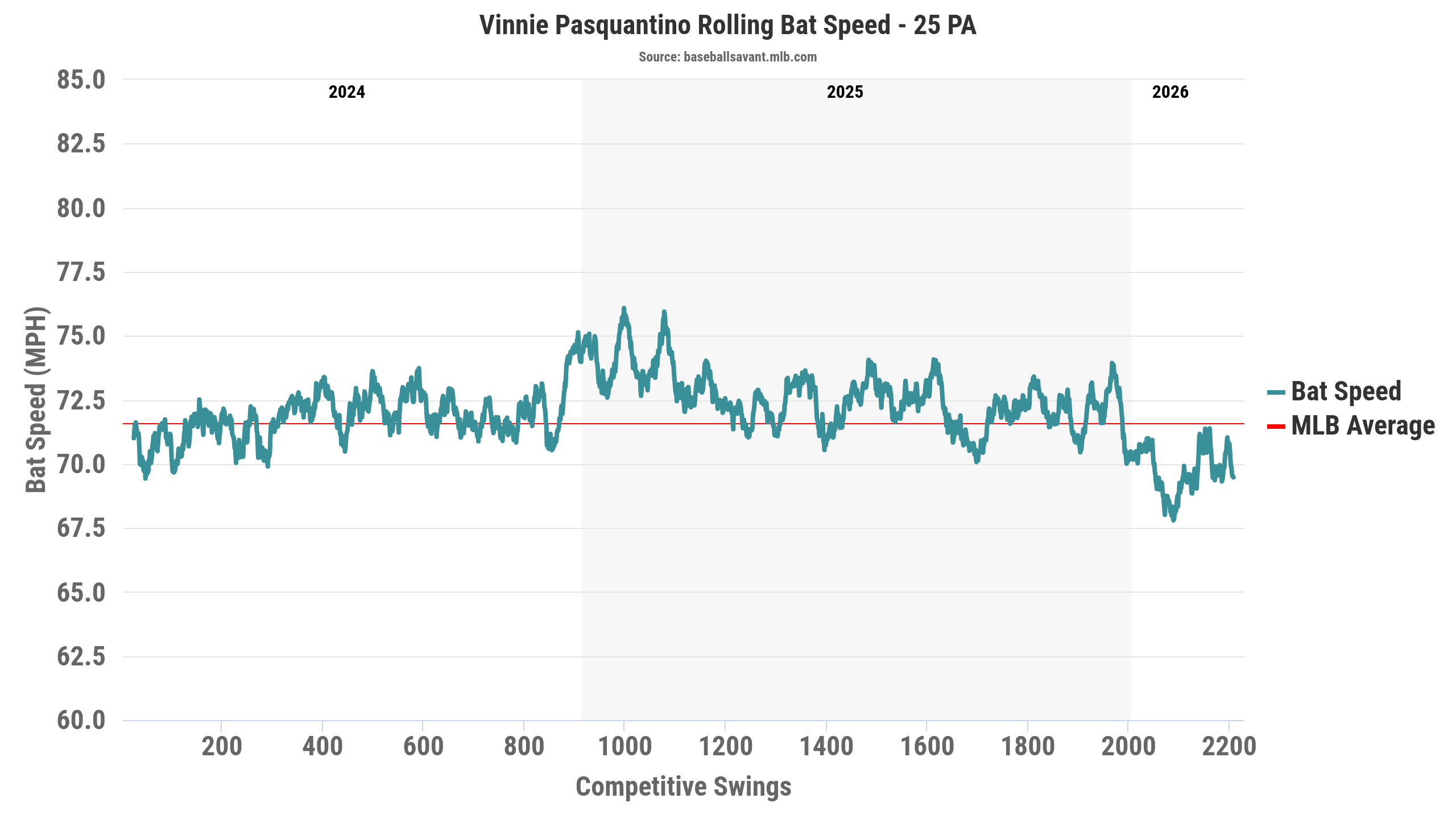 Last year, Pasquantino generated an average bat speed of 72.5 MPH and a fast swing rate of 26.4%. That was better than his 71.7 MPH and 19.8% fast-swing rate in 2024. Unfortunately, his average bat speed this year has declined to 69.6 MPH, and his fast-swing rate is only four percent. When looking at his rolling bat speed chart over his career, he has seen quite the decline this season, and the trend isn’t looking good.