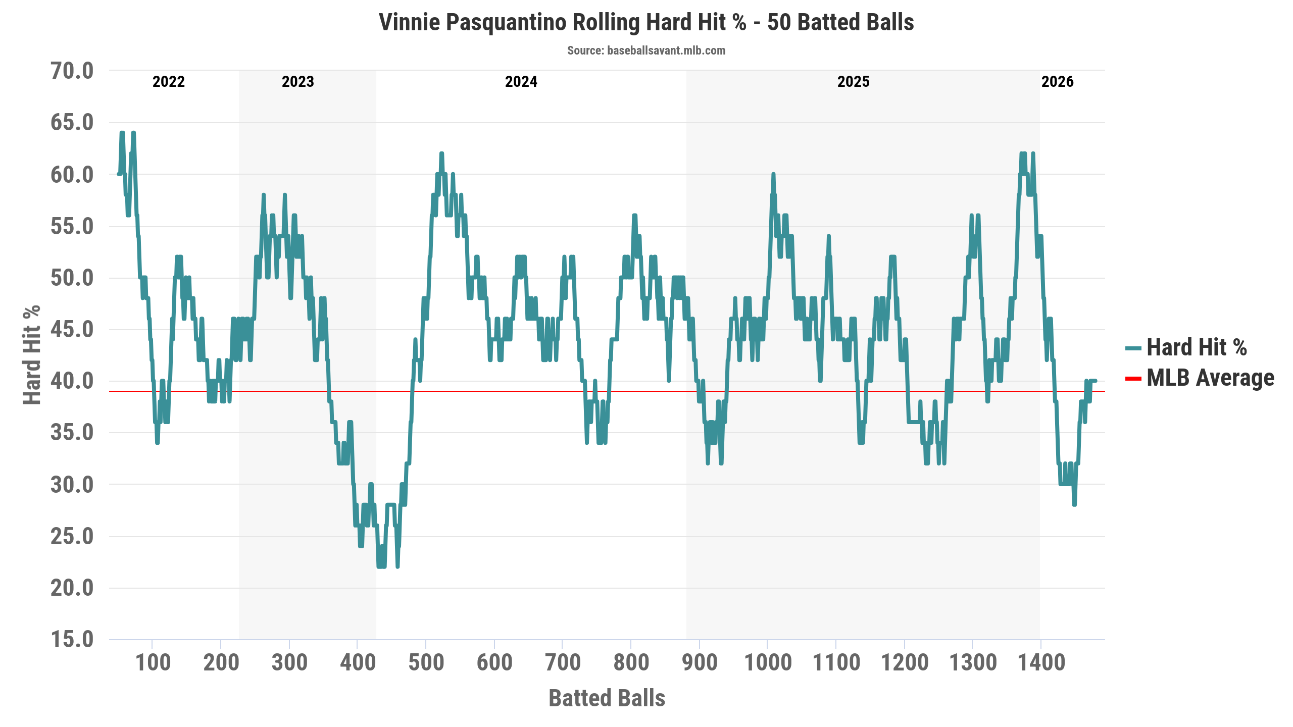 The biggest concern right now with Pasquantino may be his hard-hit rate. His 35% hard-hit rate is 9.7% lower than a season ago and ranks in the 23rd percentile. He has seen a dramatic drop from where his rolling hard-hit chart was at the end of last season, though it’s been creeping back to at least league average after sitting in the 30% mark for most of the 2026 season.