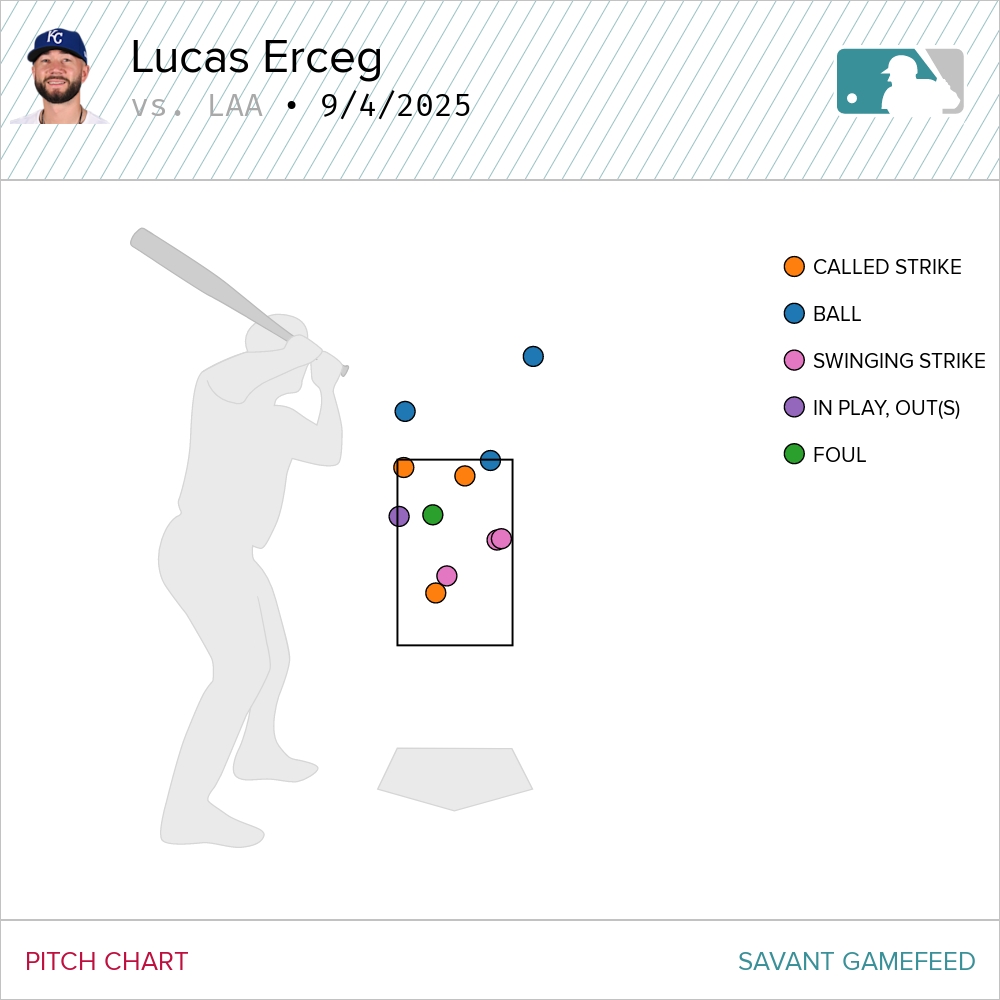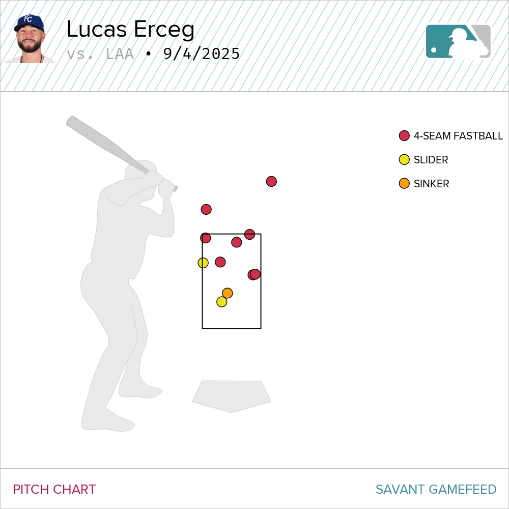 Erceg was more fastball-heavy with his arsenal on Thursday in his one-inning, 11-pitch, and two-strikeout performance. Here’s a look at the pitches he threw and where they were located, via Savant.