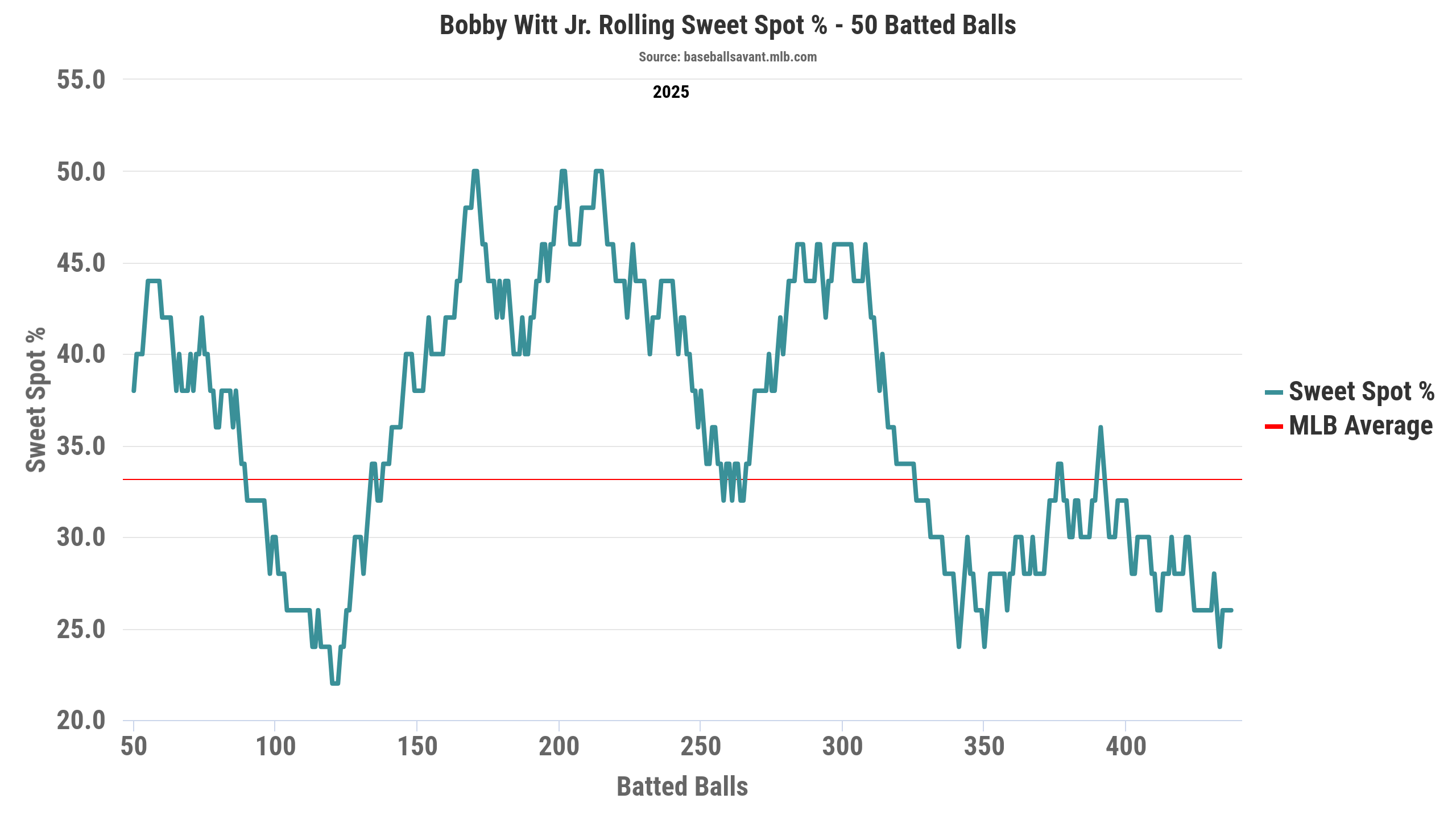 The Royals need Witt to get back to the Sweet-Spot percentage he was sporting from the 150th batted-ball to 300th-batted-ball mark.