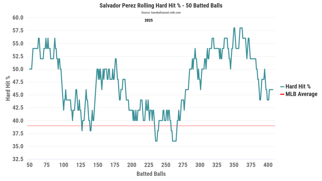 A silver lining with Perez’s recent struggles is that he is still hitting the ball hard, well above the league average, as illustrated in his rolling hard-hit rate chart, via Savant.