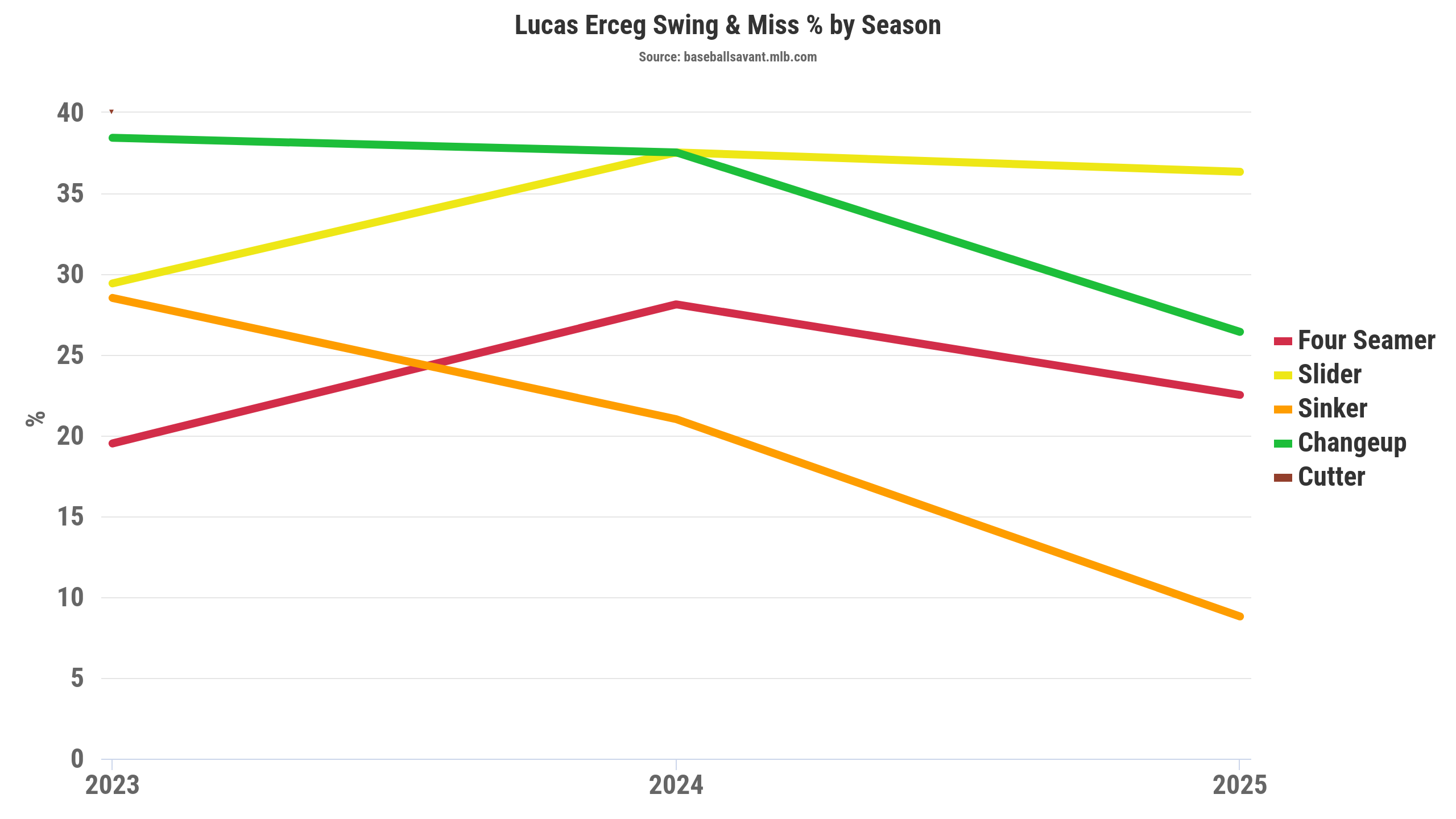From 2024 to 2025, his changeup whiff rate has declined 11.1%, his sinker whiff rate has declined 12.2%, his four-seamer whiff rate has dropped 5.6%, and his slider whiff rate has declined 1.2%. Thus, it’s not a surprise that Erceg’s strikeout rate has declined 9.3% this season.
