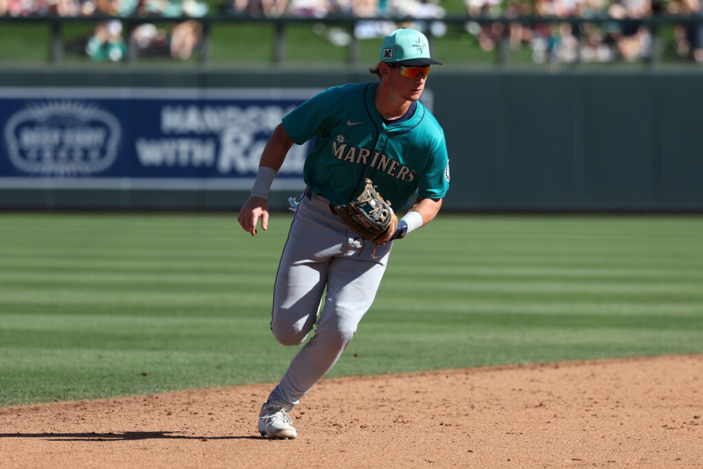 Colt Emerson, the Mariners’ first-round draft pick in 2023 and Just Baseball’s No. 5 overall prospect, has quickly ascended through the minors. While early spring training stats may not be all that glamorous, he has quickly become the Mariners’ top prospect at just 20 years old. Emerson boasts a smooth left-handed swing and has showcased solid defense across multiple infield positions.