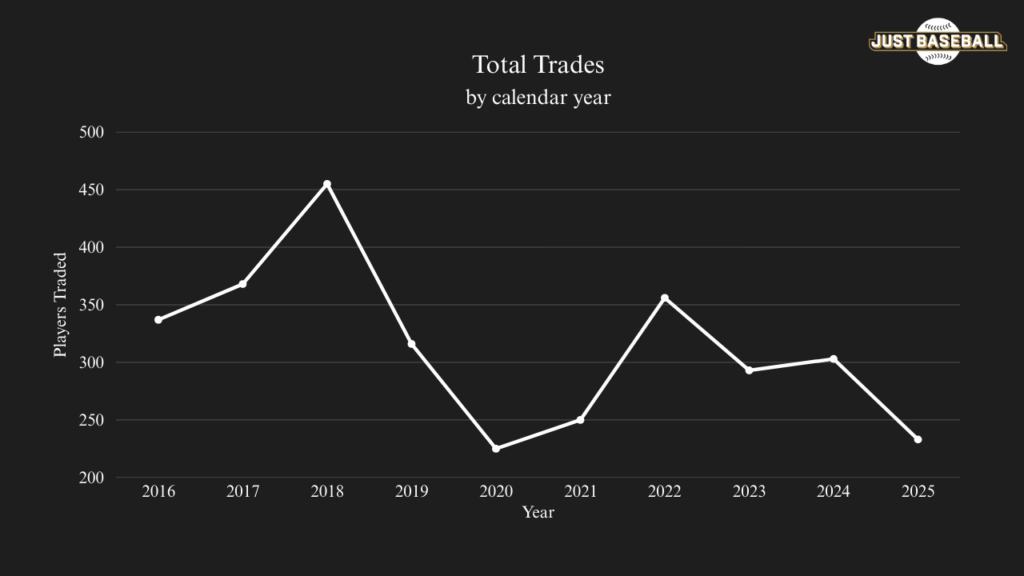 In short, 2025 has had fewer trades because fewer players are available to be traded for. However, there’s more to the story than just that. Let’s do some quick math to prove this.