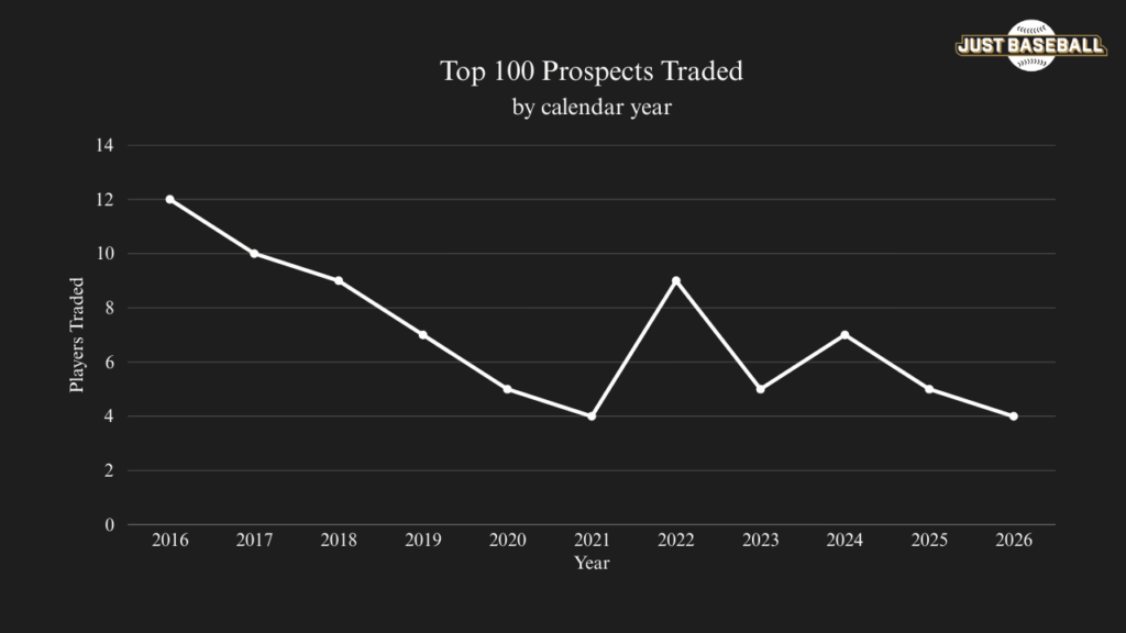 However, 2026 appears to be a resurgence. We’ve seen four top prospects traded since January 1st, which is near the top of the list for the most top prospects traded in a 40-day window. 2026 is setting up to be one of the biggest years for trading in recent memory. This article will answer the ‘why’.