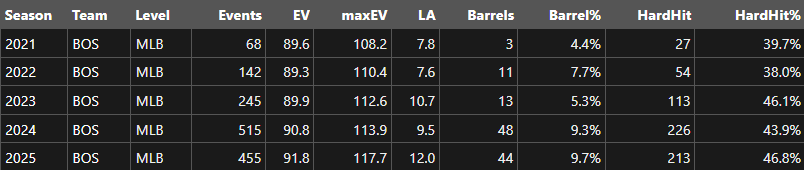 As more of a guy who can hit for power than a true power hitter, he does too much of all three. Even in 2024, where he was around 50th percentile for all three, it created several instances of prolonged struggle for Duran and the Red Sox offense.