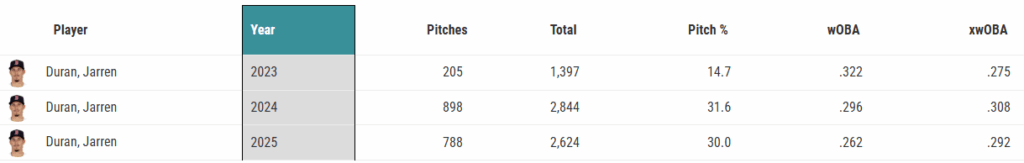 It’s hard to see a world where Duran becomes a good hitter against the weak side of the platoon, but he doesn’t have to be. Considering he underplayed his xwOBA by 30 points against them in 2025, there’s reason to believe he’s closer to his 2024 self.