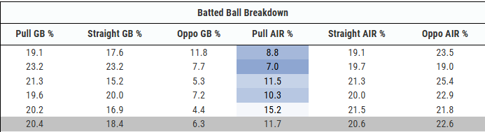 In an era of “pull the ball in the air,” he’s something of an anomaly. He’s strong enough to muscle one out to the pull-side well over 400 feet. He’s just more likely to drive a ball to center, or oppo, than he is to pull it; that much is consistent with his entire career, despite mixed results.